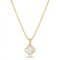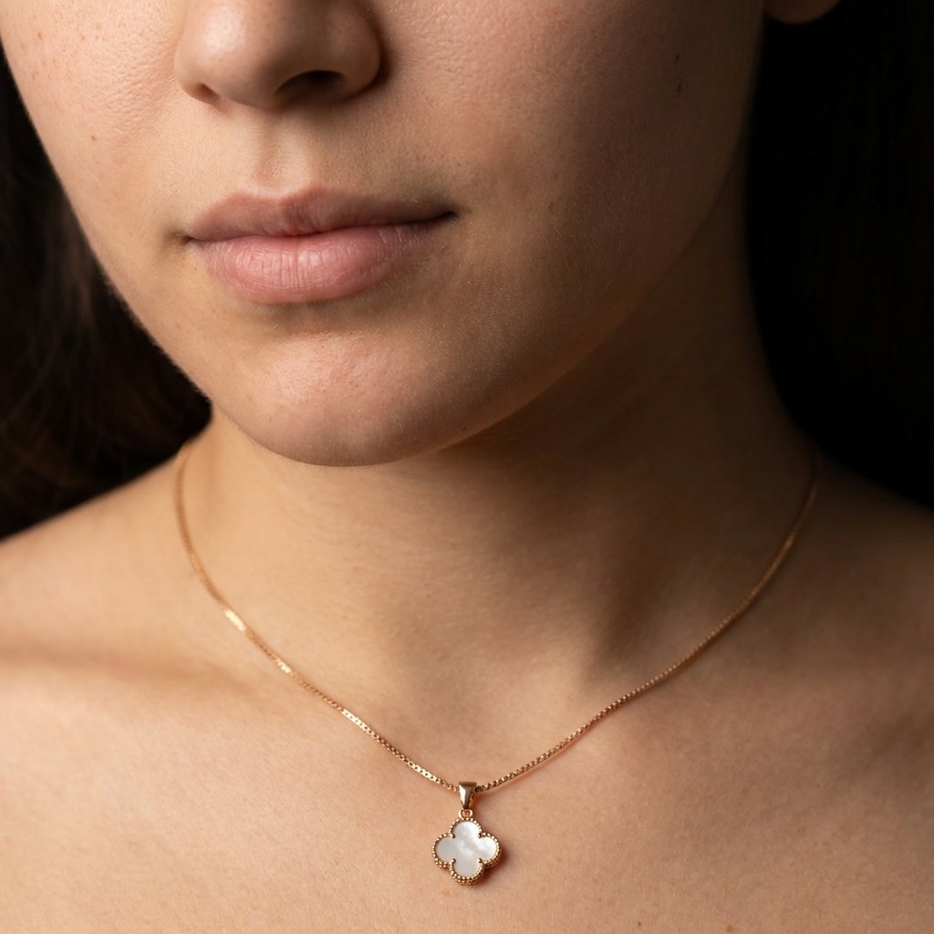 Seu pingente em formato de flor apresenta um design elegante, com contorno trabalhado em banho de ouro 18k e interior preenchido por madrepérola, criando um efeito luminoso sutil, refinado e extremamente feminino.
