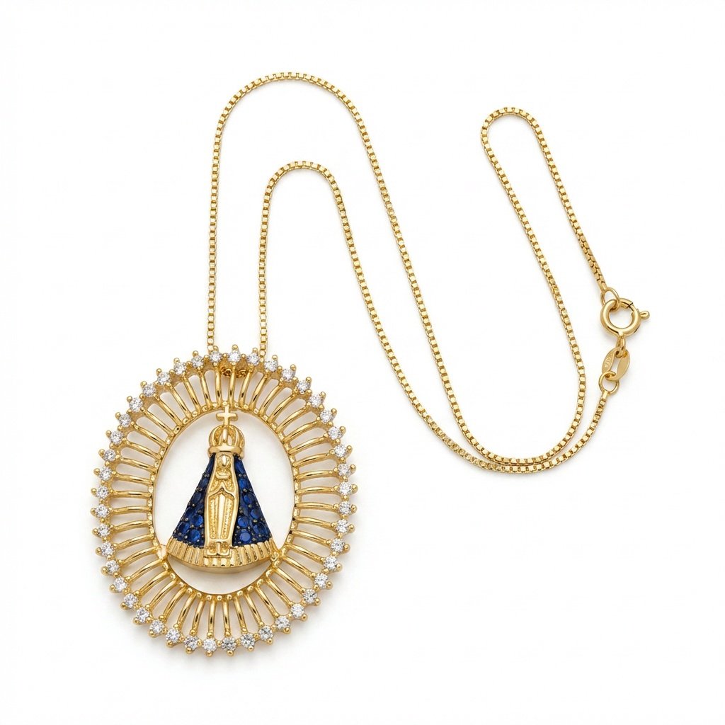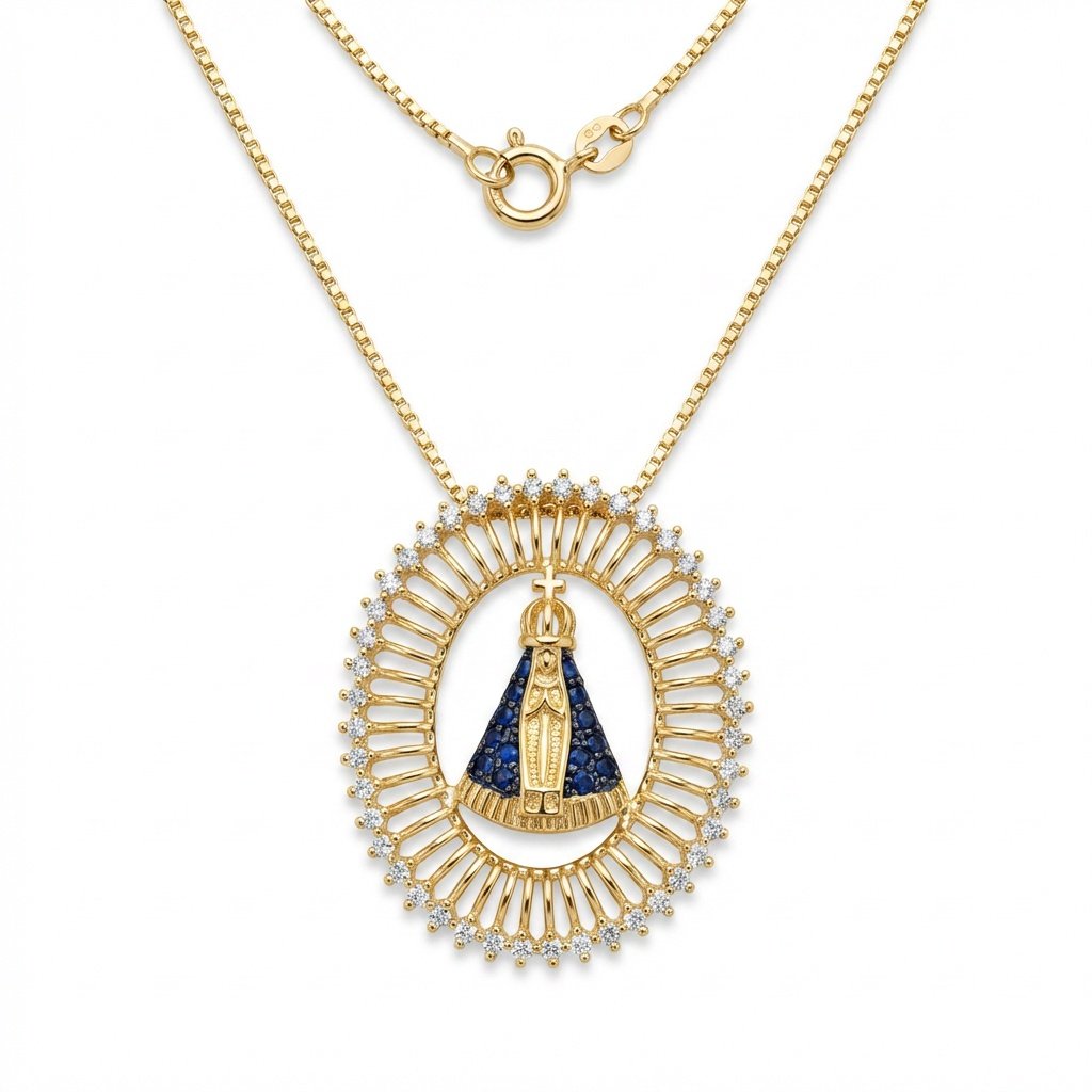 O pingente apresenta a imagem de Nossa Senhora, delicadamente trabalhada com aplique em azul, destacando-se no centro de uma estrutura circular com acabamento refinado. Ao redor, um halo formado por microzircônias cravejadas cria um efeito luminoso intenso, simbolizando luz, proteção e espiritualidade.