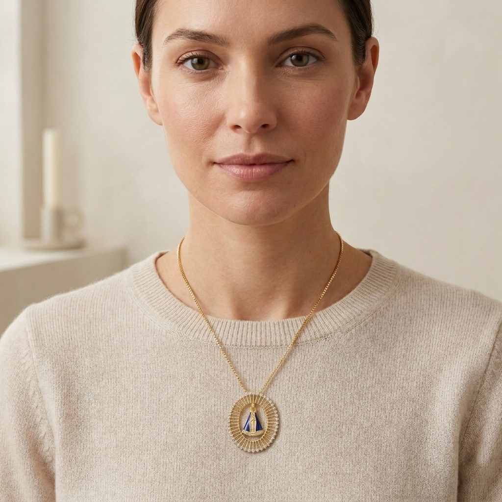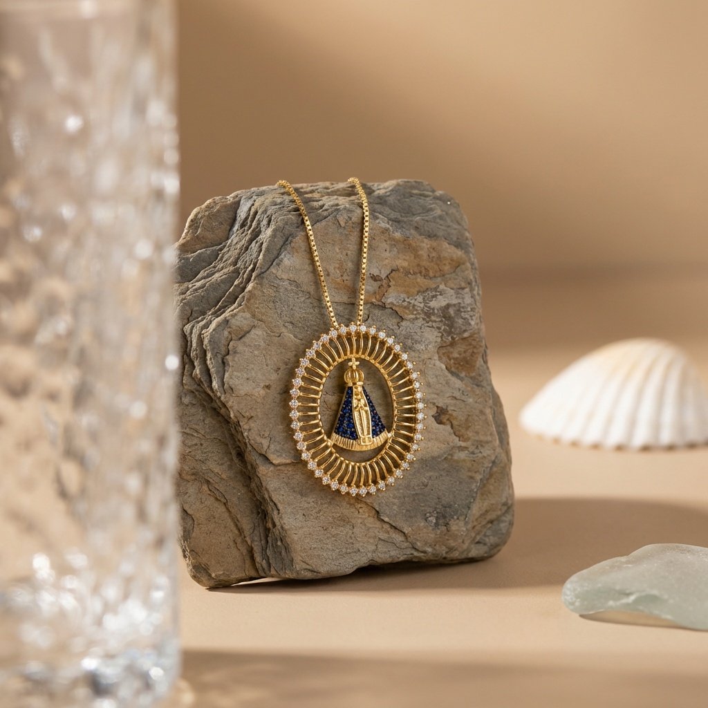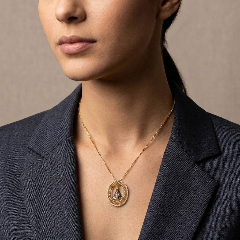 O Colar Nossa Senhora Luz Divina 18k é uma peça que une fé, proteção e sofisticação em um design rico em detalhes e brilho.
